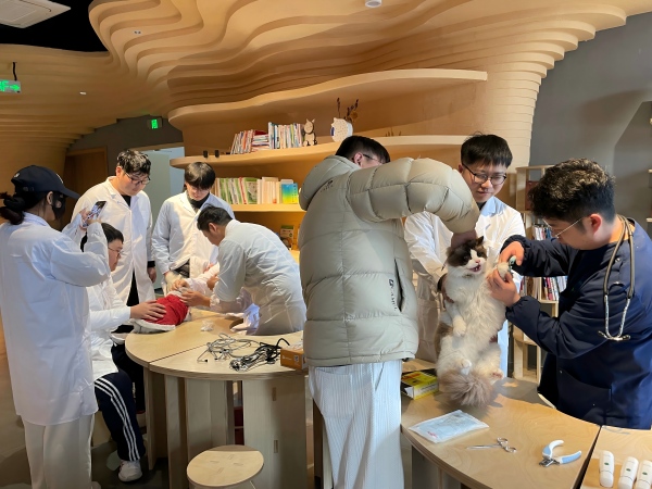 本次公益诊疗以“科学养护、文明同行”为主题,紧密配合金山猫村新春“马年游马”活动,面向游客携带的宠物猫开展免费基础医疗与健康指导服务。活动现场,党员教师发挥专业特长,为每只宠物进行细致检查:开展心肺听诊、皮肤检测及内眼睑观察,排查潜在健康问题;进行耳道检查、清洁以及体外驱虫处理,保障宠物体表卫生与舒适;协助完成宠物保定、指甲修剪等日常护理,耐心呵护每一只陪伴游客出行的“喵伙伴”。