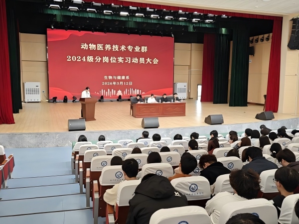 | 动物医养技术专业群召开2024级分岗位实习动员大会 | | 来源: 点击数:45次 更新时间:2026/3/20 15:32:15 | 为帮助2024级学生深刻理解分岗位实习的重要意义,明确实习要求,确保分岗位实习工作平稳有序推进,3月12日下午,生物与健康系动物医养技术专业群隆重召开2024级学生分岗位实习动员大会。系副主任曾叶纯、专业群副主任许二学、实训室主任吕照勇及专业群全体教师出席会议,会议由党务学工科科长吴华健主持。