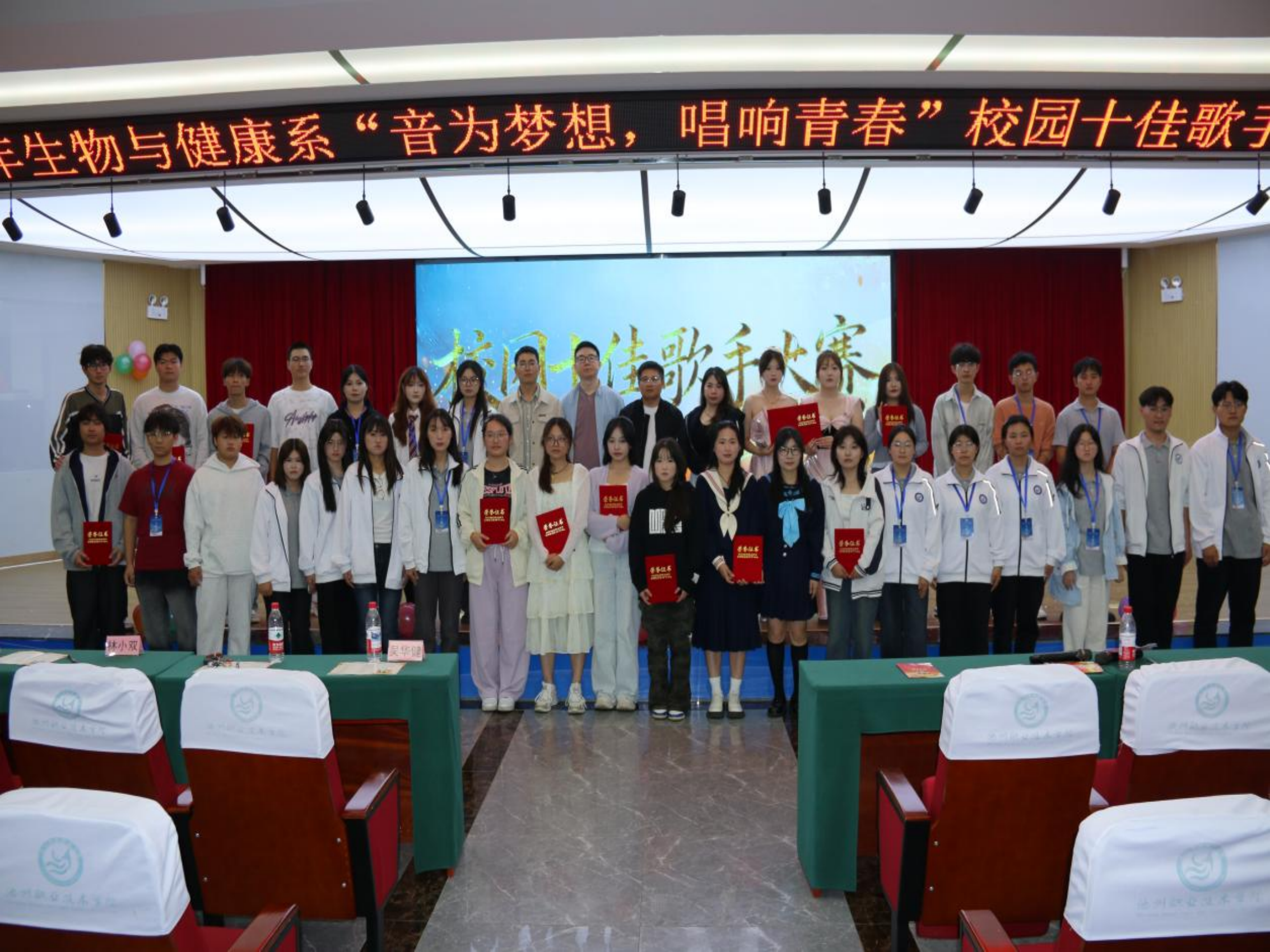 动感的开场舞瞬间点燃全场热情,十二位参赛选手依次登台献唱。一曲《南山南》婉转低回,悠扬的旋律与略带伤感的吟唱,仿佛将观众带入静谧深沉的秋夜,引人无限遐思;而《我爱你中国》则以磅礴大气的演唱和真挚热烈的情感,抒发了深厚的爱国情怀,引发全场师生强烈共鸣。歌声激昂、感人至深,赢得掌声与喝彩不绝于耳。中场与尾声的精彩舞蹈表演,以及穿插其间的趣味抽奖环节,不断将现场气氛推向高潮。经过激烈角逐,本届“校园十佳歌手”获奖名单最终揭晓。在热烈的掌声中,系部领导及老师为获奖选手颁发荣誉证书,对他们的精彩表现给予充分肯定。